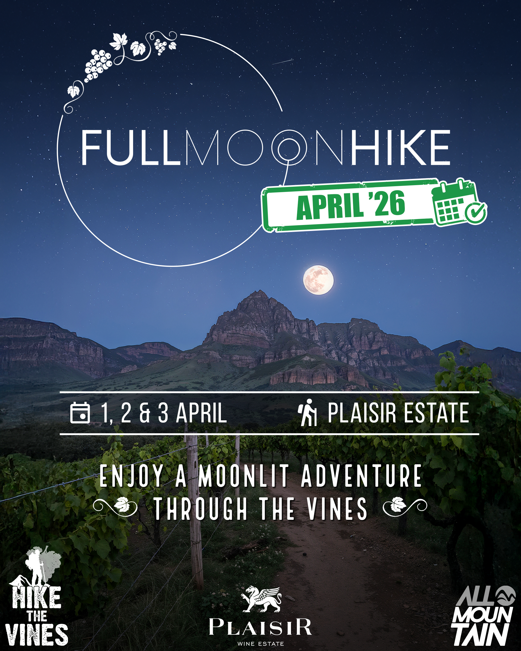 Rooted in History, Refined by Nature – join us for a magical moonlit adventure at Plaisir Wine Estate, as we explore forest trails, catch the sunset, and watch the full moon rise from the slopes of Simonsberg.